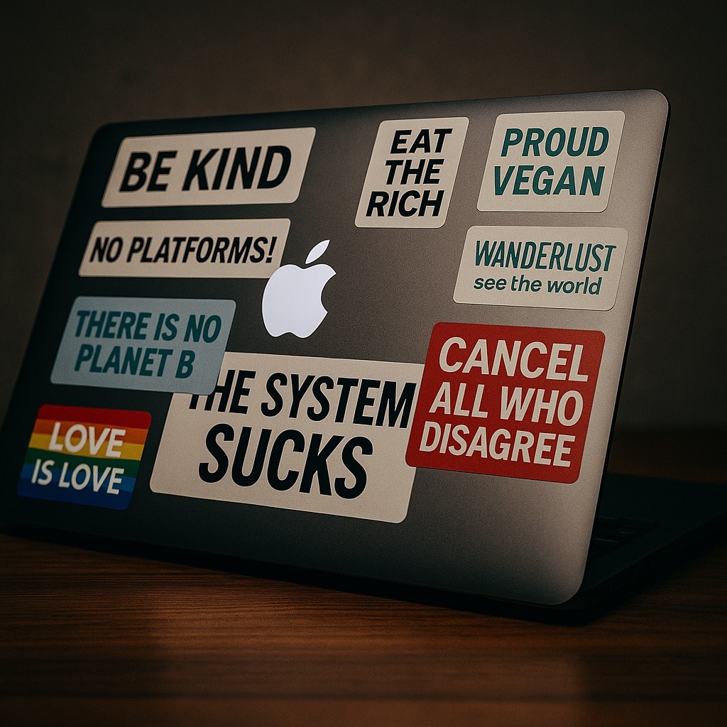 But it wasn’t the screens that caught my attention, it was the stickers. Every laptop was plastered with messages rejecting something or supporting something else that rejected something else. Environmental slogans, anti-establishment logos, identity flags, all stuck across the symbol of corporate conformity itself.