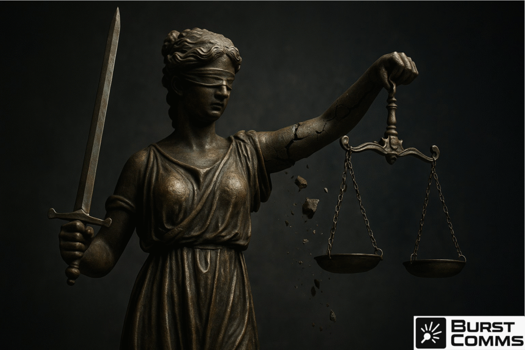 The symbols of justice cracking under the weight of a system that no longer holds.